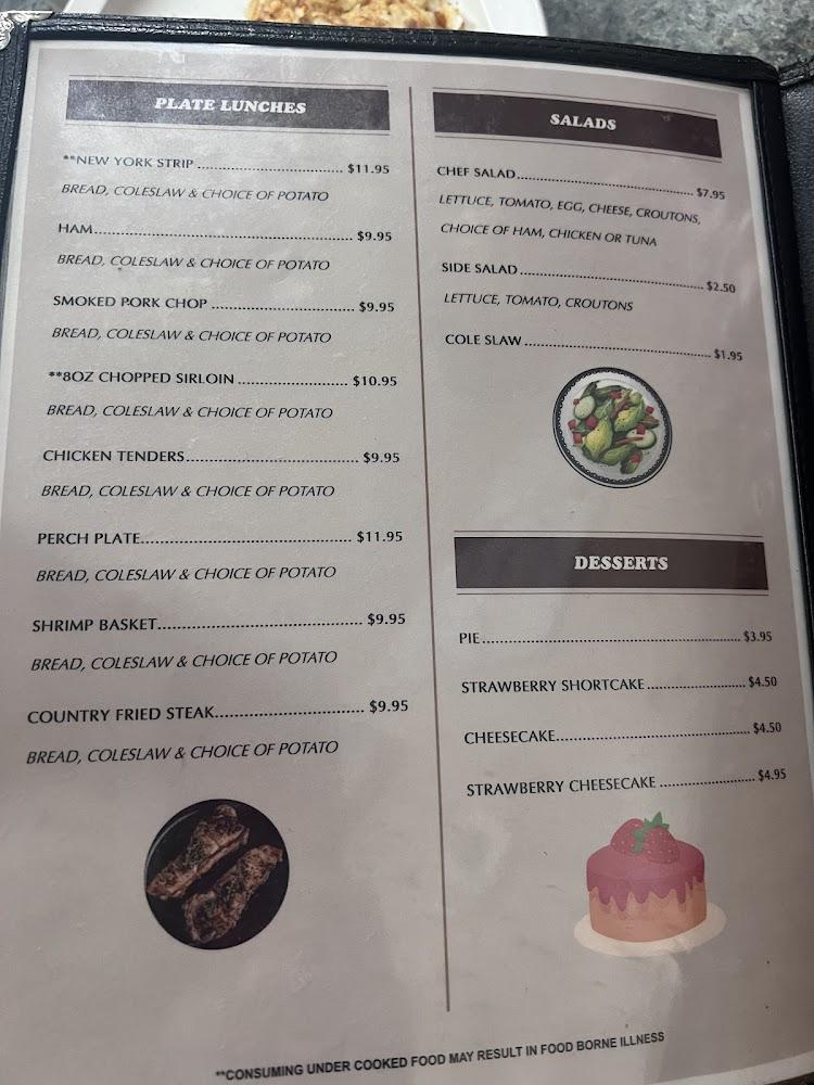 Lunch options include sandwiches, salads, and plate lunches. Favorites like chicken tenders and smoked pork chops are available, providing options for everyone. Desserts like pie and cheesecakes add a sweet ending to meals. The menu is broad, with something tempting for every preference.